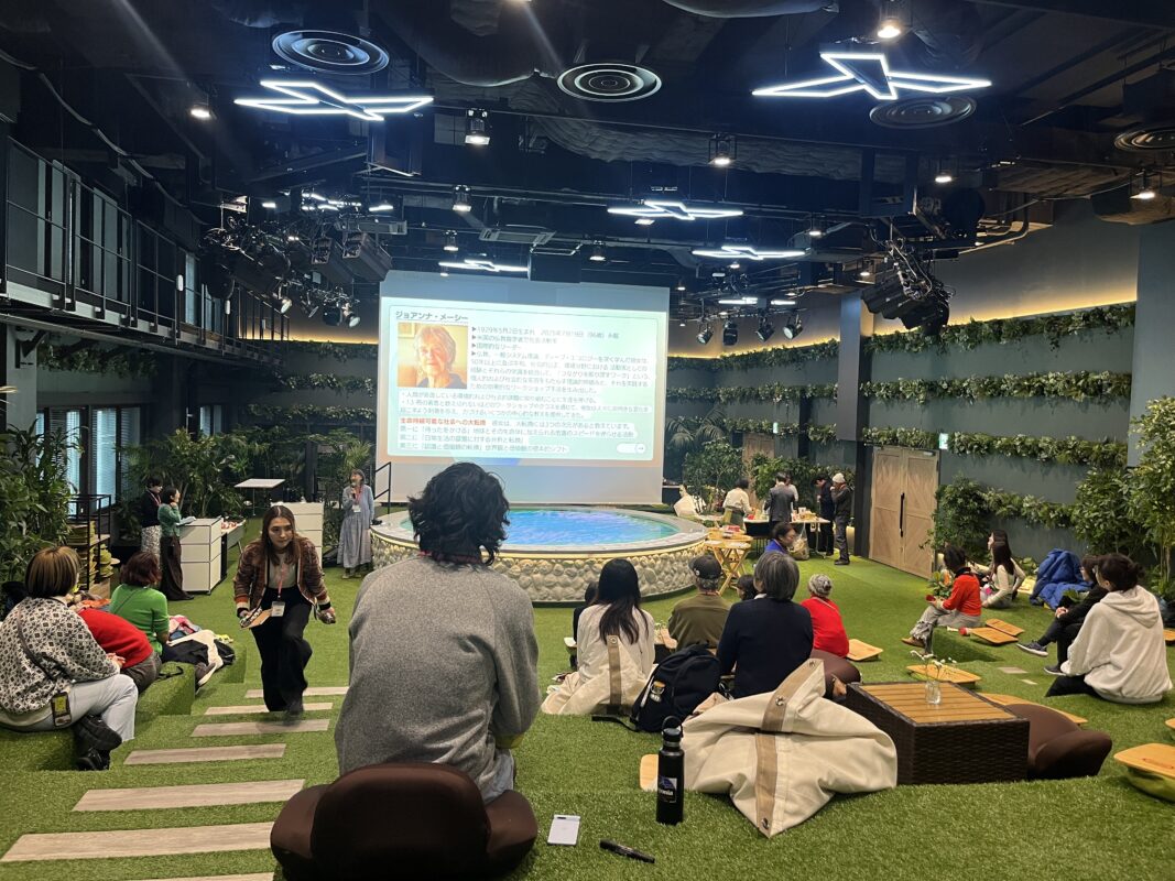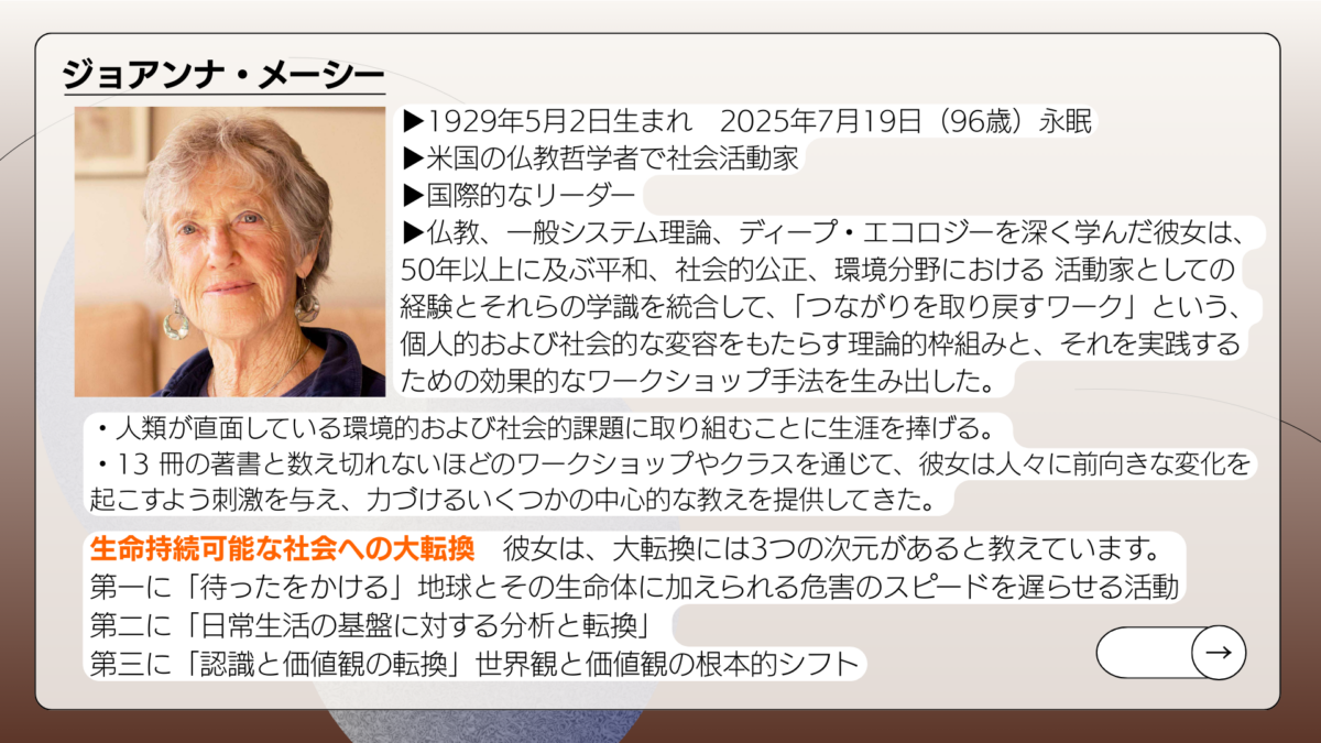 主催であるコミュニティ気候アクションコンソーシアム(CCAC)のメンバーから、「つながりを取り戻すワーク」を考案し、2025年7月に永眠したジョアンナ・メイシーの紹介がありました。世界の痛みを知り、それを社会変革のエネルギーに変えていく考え方を共有しました。