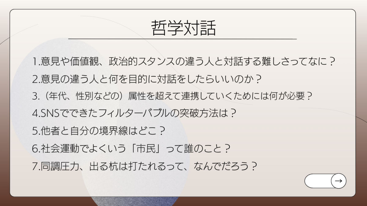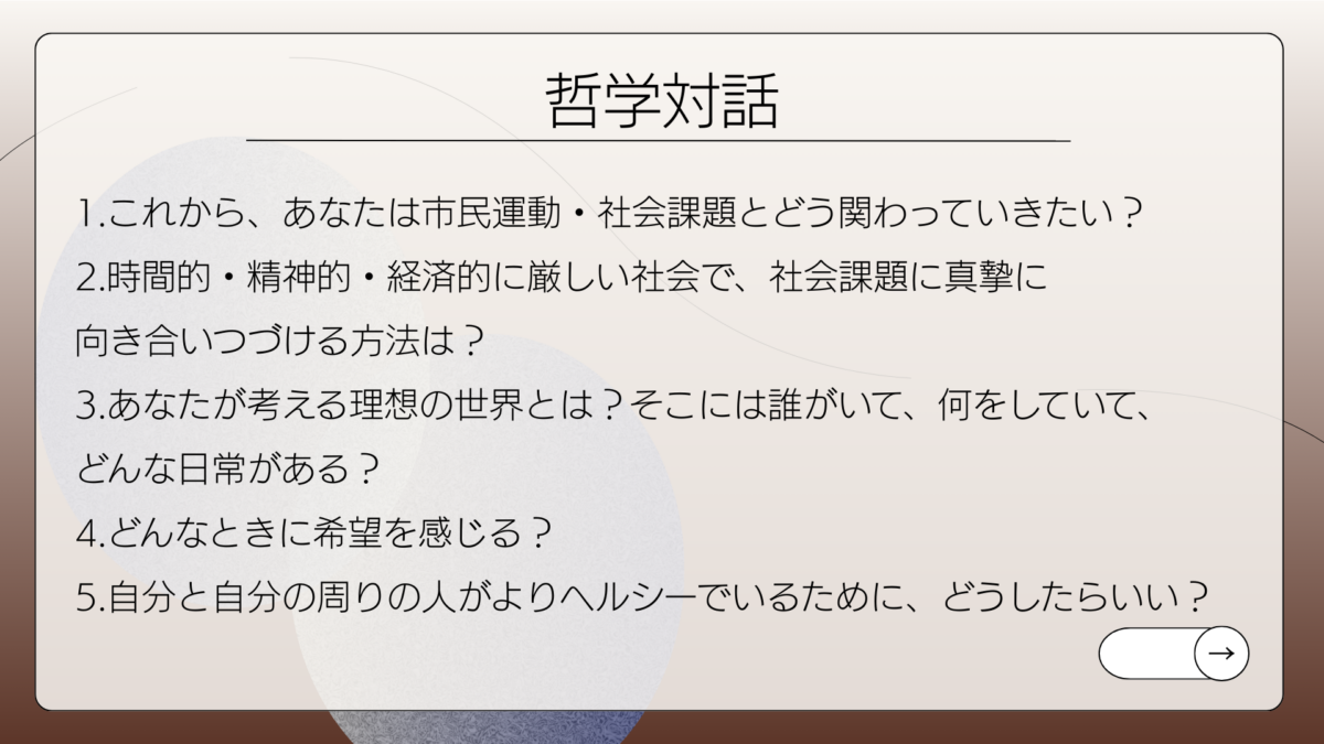 - 哲学対話などを通じて、参加されている方々のこれまでの体験や経験を垣間見ることができたことが楽しく、視野が広がったと感じました。また、参加されている方々の何名かもおっしゃっていましたが、「楽しむこと」「どのように物事をプラスに捉えるか」は大事なことだと改めて感じました。フォーラムで得た気付きを、日常生活でも活かしていきたいと思います。ありがとうございました。