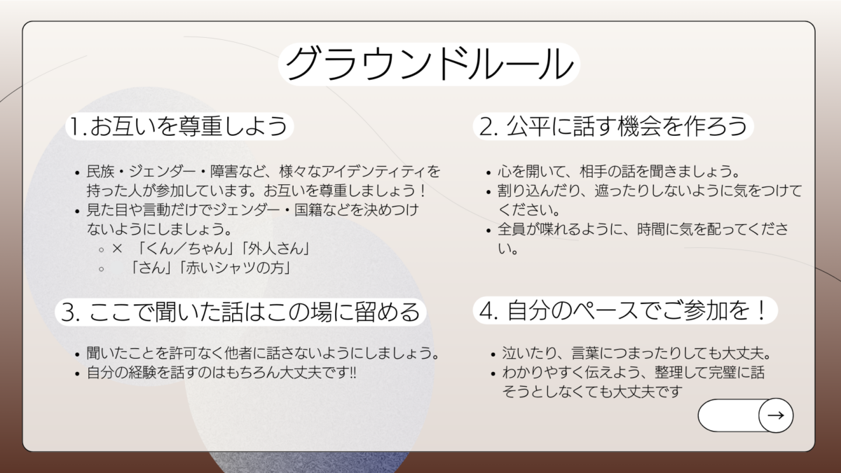- 繋がりを体を動かして取り戻す感覚・イメージを得れたのが印象的でした。BGMがとても良くて居心地が良い雰囲気でした!イベントの構成が小規模での対話を重視していたため、多くの参加者の人とお話しすることもできました。これまで知り合いだった人のこともより深く知ることができたし、初めての人とも新しい繋がりを作ることができました。