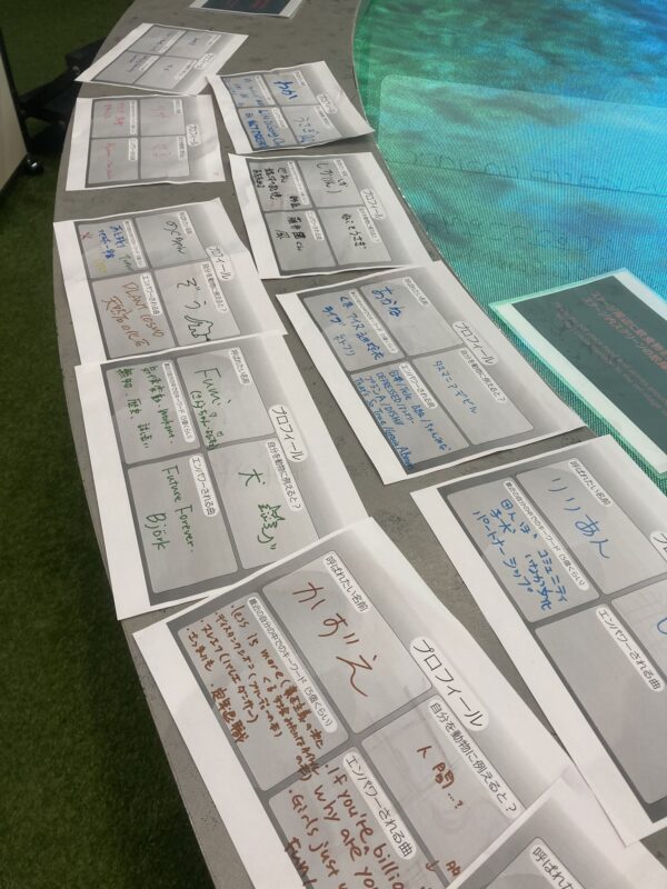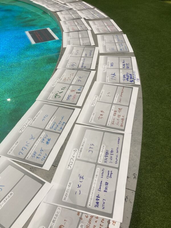 当日の朝、10時の開始を目指して会場に集まった参加者には、受付後に、休憩時間などで活用してもらえるよう、プロフィールを記載してもらいました。記載してもらったのは、「呼ばれたい名前」「自分を動物に例えると?」「最近の自分の中でのキーワード(5個くらい)」「エンパワーされる曲」です。