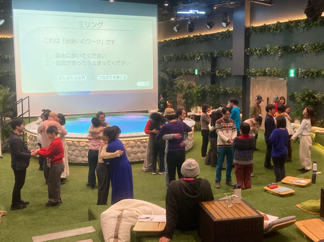 - ミリング(出会いのワーク) 会場内を自由に歩き、合図で止まり、自分自身の内面や他者とつながりを感じるワークを行いました。意識のちょっとした変化が、世界の見え方までも変えてしまうような体験になりました。