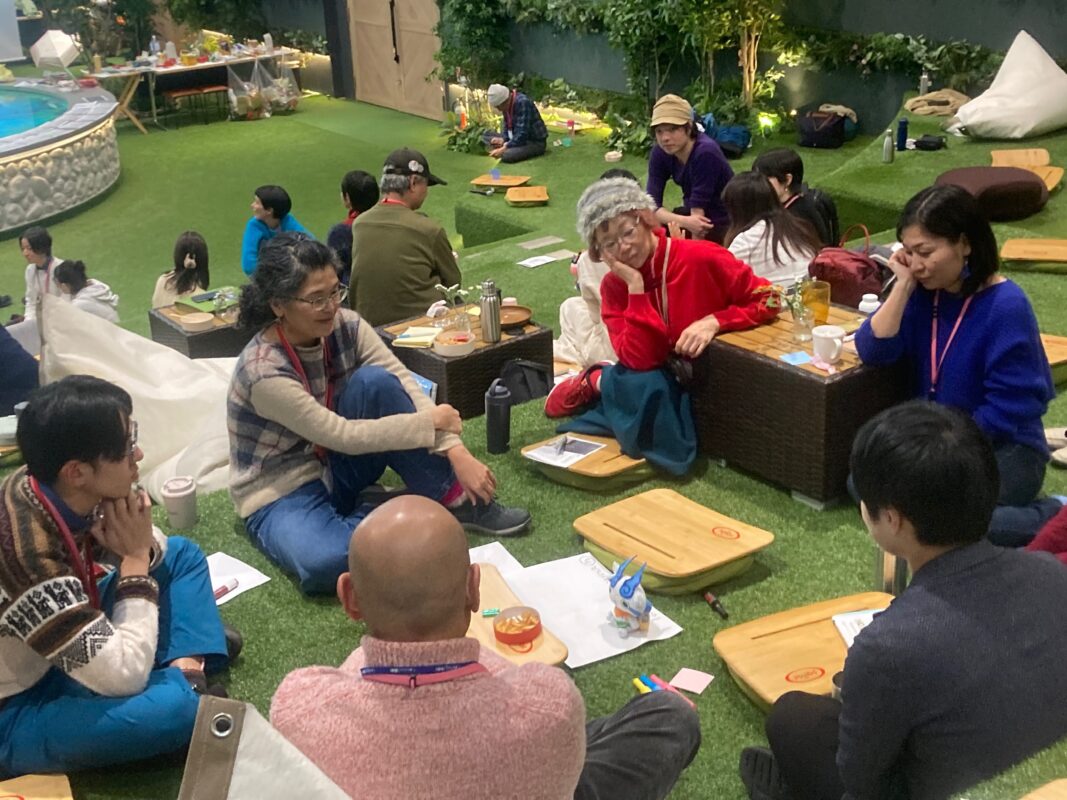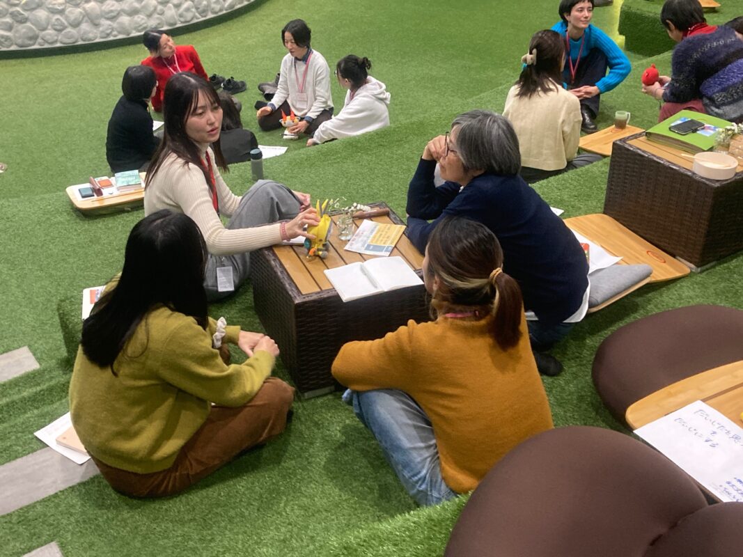 - セブンスジェネレーション 「現代の人」と「7世代先の人」になりきり、200年後の未来から今の活動を見つめ直す対話を行いました 。未来の世代から「混沌としている今の世界に生きるのはどんな感じなのでしょうか?」「活動をあなたに決意させた、そのきっかけはなんでしょうか」「あなたが最初にとった行動はなんでしたか?」「活動する強さや力を一体どこから得ているのですか?」「暗く危険な時代の中に再び戻っていく現代の人にどんな言葉をかけたいですか?」と問われ、自らの原点を再確認する時間となりました。