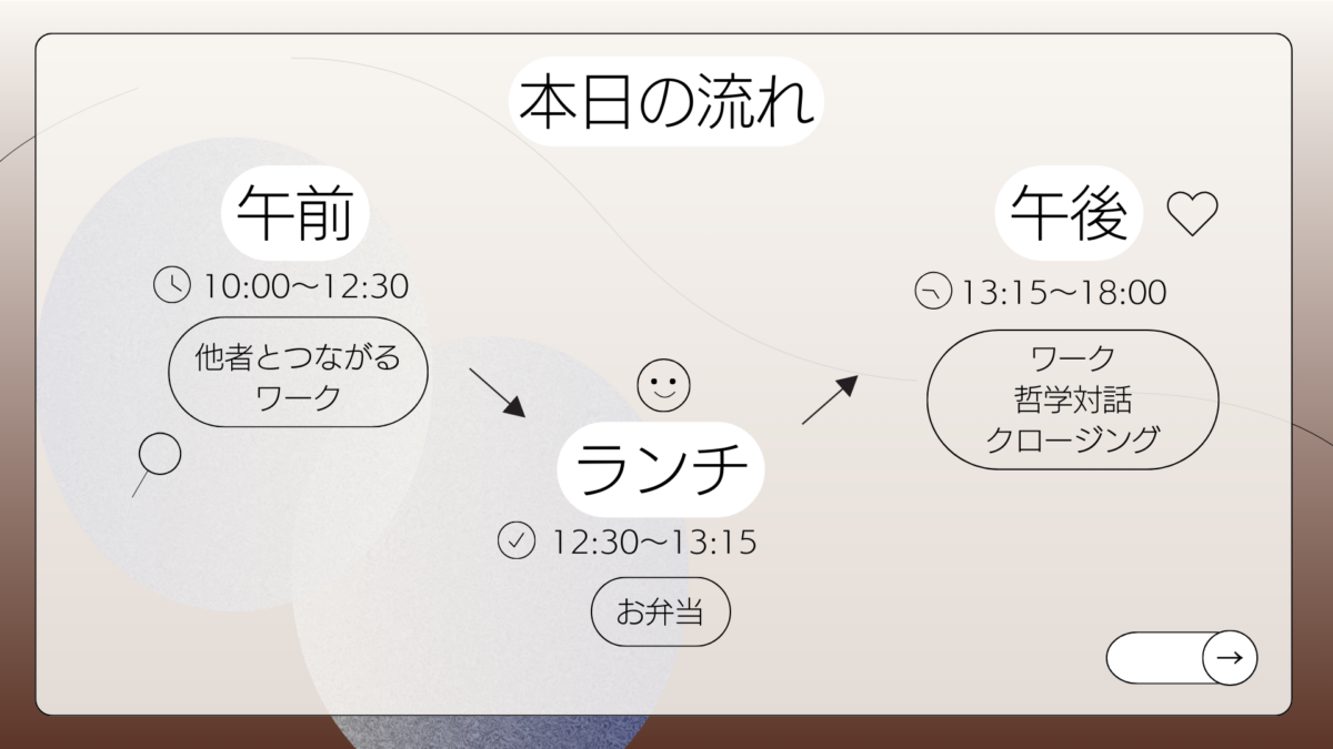 午後は身体を動かしながらの体験的ワークと哲学対話を中心に、関係性の中にいる自分という存在や、過去や未来とのつながりを感じ、言葉にする時間をもちました。